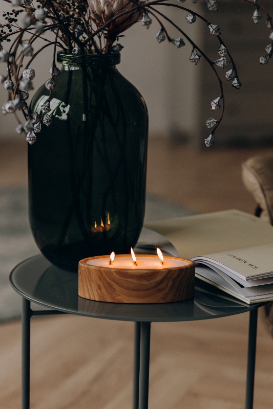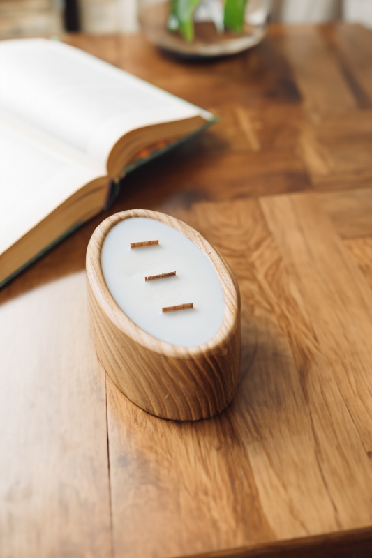 соєвий віск, екологічні ароматичні олії, дерев’яний гніт, дерев’яна форма.